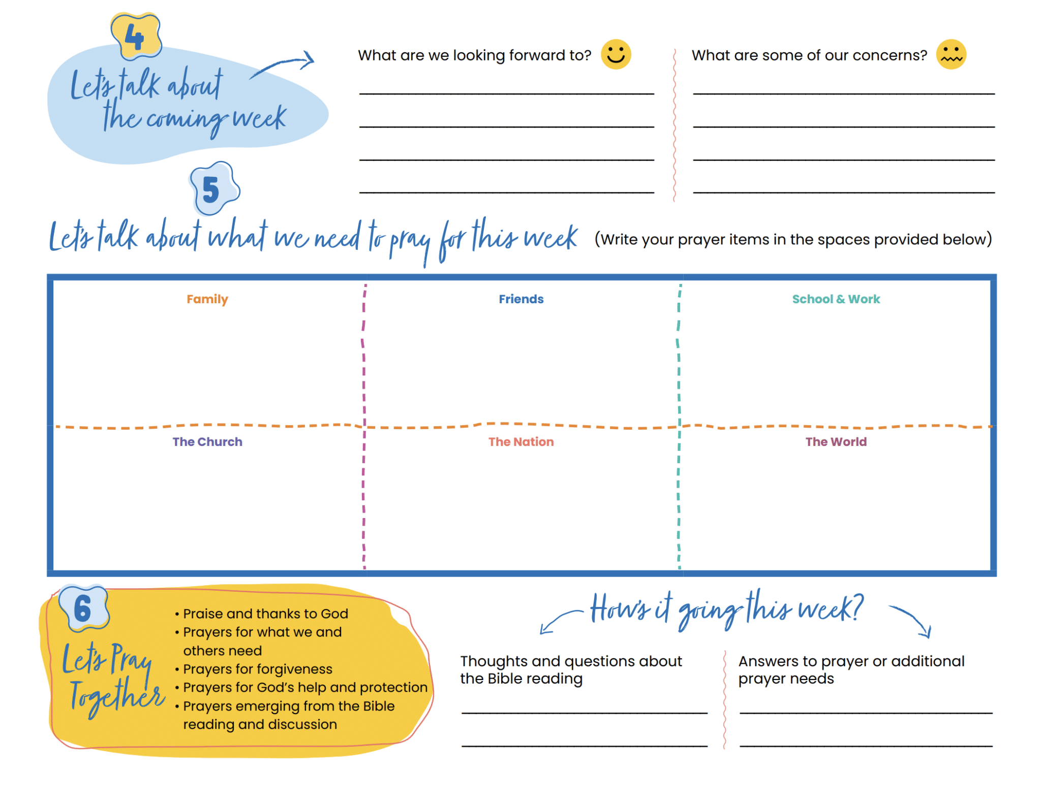 - Praying together using a helpful guide for key areas of focus