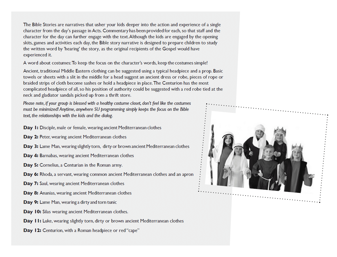 Each of the daily program outlines can be adapted for various-sized programs or a variety of settings: city park outreach, beach missions, camp chapels and devotions—any place where children gather! You’ll find that the skits and stories focus on the relationships and dialog between the characters; they will engage you and your kids in the action regardless of your program location. The material is not presented as a fixed curriculum, but rather as a collection of teaching tools (stories, skits, games, activities, and songs) that can be arranged and rearranged to fit the gifts of your ministry team, the needs of the children you serve, and the demands of your particular setting on a particular day.